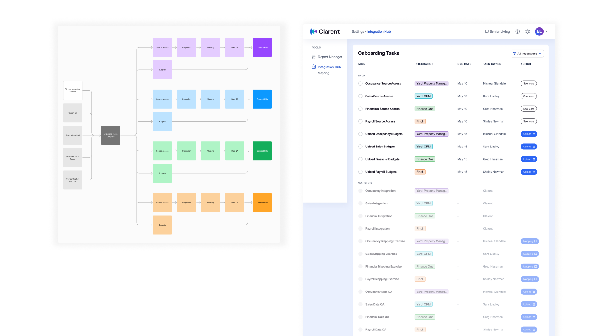 Clarent is a software platform that enables senior living owners & operators to see all their data in one place and make better decisions. To do this, we integrate with their Sales, Occupancy, Financial, Payroll, and Medical systems, and use it to produce a library of 100+ KPIs that users can make into reports.
