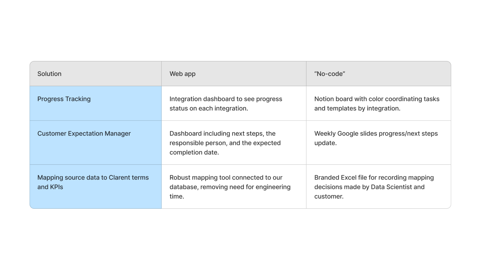 The second option is to build an "Integration Hub" within the web application that our internal Customer Service, Data Science, and Engineering teams will use to onboard customers. This is the more scaleable longterm solution.