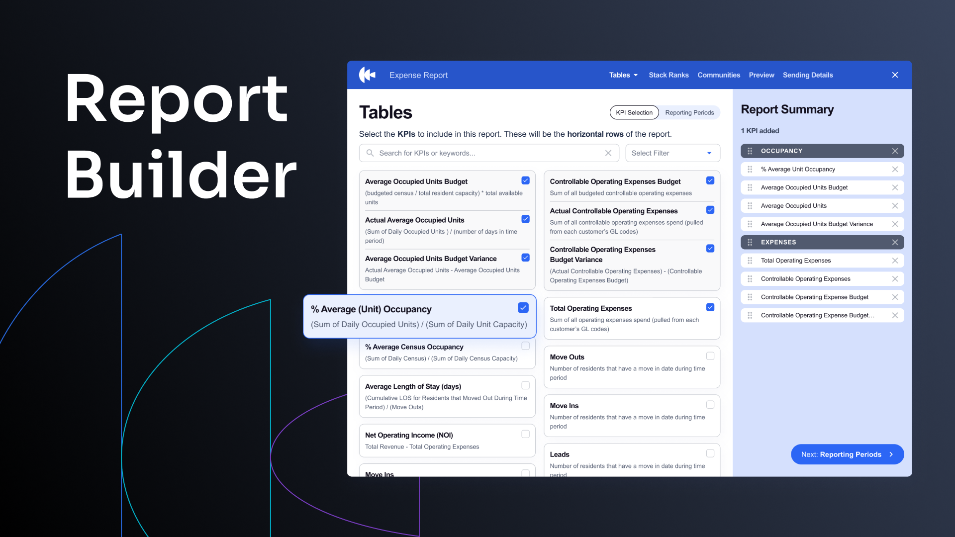 The Report Builder allows senior living companies to create, manage, and customize reports for scheduled distribution. Users can modify KPIs, reporting periods, stack ranks, and communities within reports to suit their unique business needs. The tool ensures customized reports are delivered to recipient’s inboxes on a scheduled cadence.